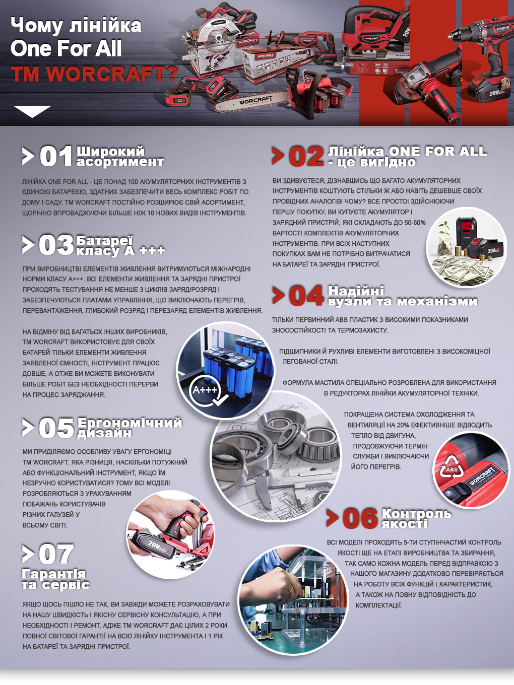 ТМ WORCRAFT представляет аккумуляторную линейку с широким ассортиментом инструмента, работающего на единой платформе батареи. Главной особенностью линейки является универсальная аккумуляторная батарея, которую можно использовать для более чем 100 видов инструмента.