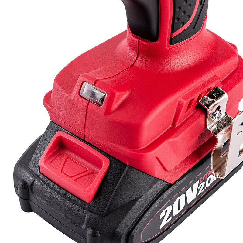 Ленточный шуруповерт WORCRAFT CDIS-S20LiBM поставляется в комплекте с усовершенствованным аккумулятором CLB-20V-2.0H, штекерным зарядным устройством и прочным пластиковым кейсом.