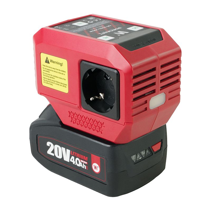 Это компактное и универсальное решение для обеспечения питания 220 В в любых условиях, используя аккумулятор 20 В линейки WORCRAFT ONE FOR ALL.