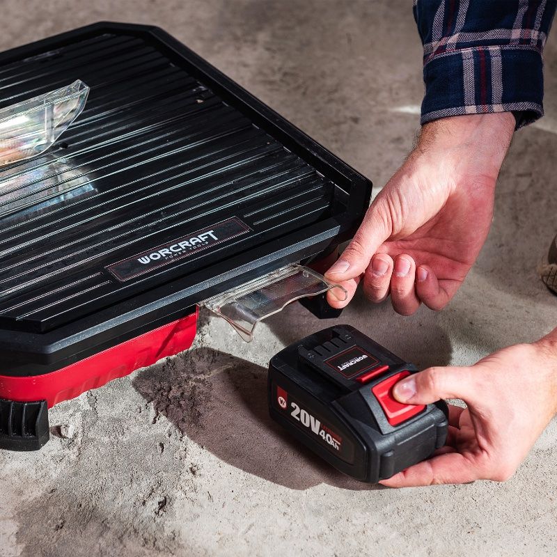 Аккумуляторный плиткорез WORCRAFT CTS-S20Li – мобильный и автономный инструмент для резки керамической, тротуарной, мраморной и гранитной плитки, а также прочих заготовок из подобных материалов.