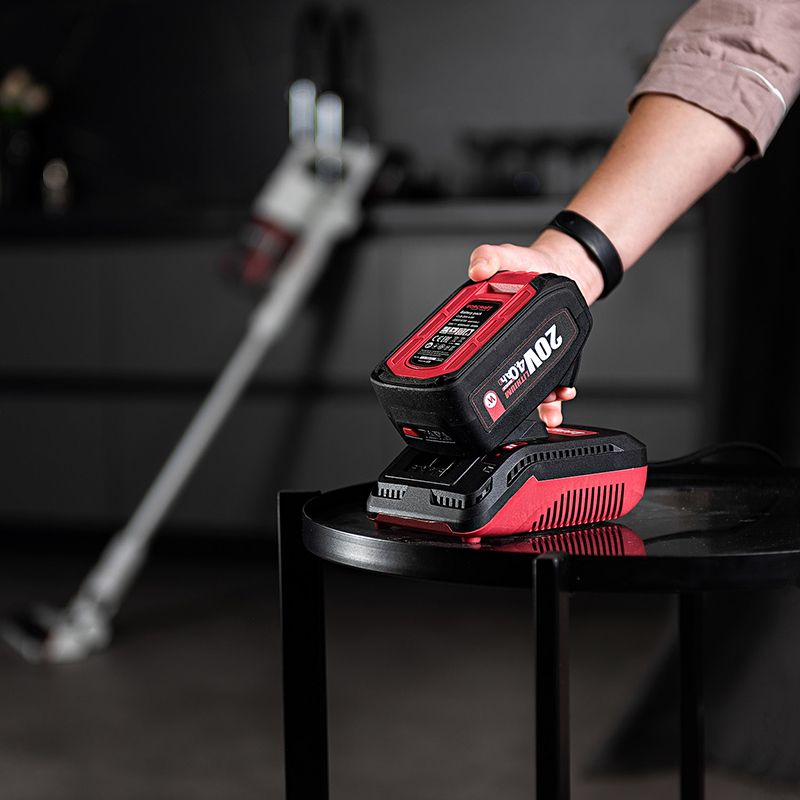 Пылесос WORCRAFT CPVC-S20LiB поставляется в комплекте с мощным аккумулятором и зарядным устройством.