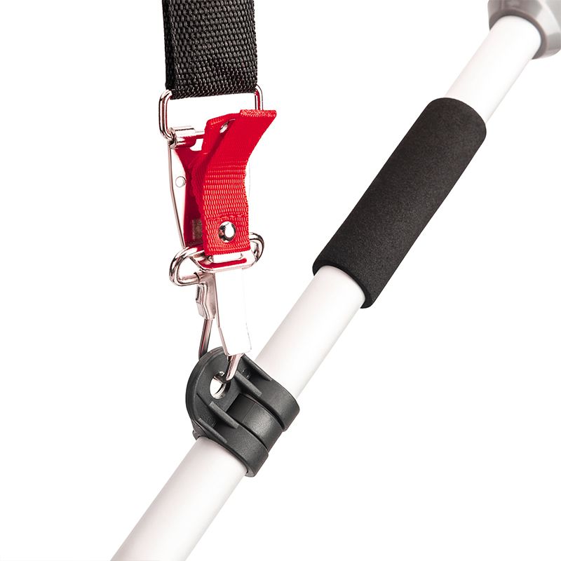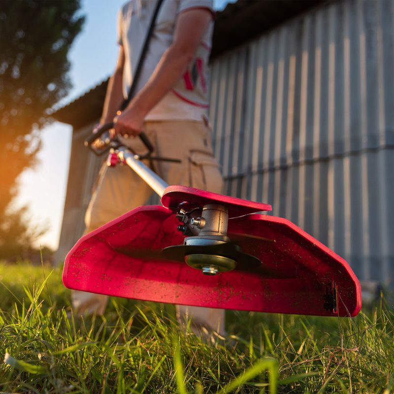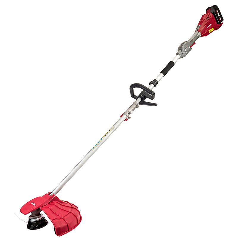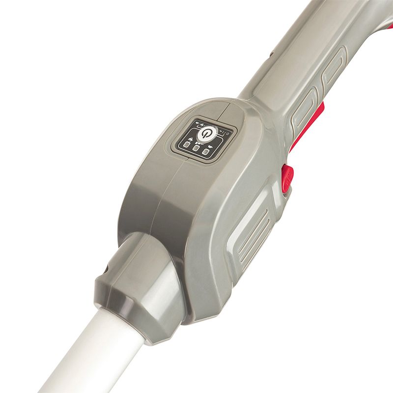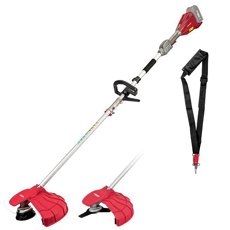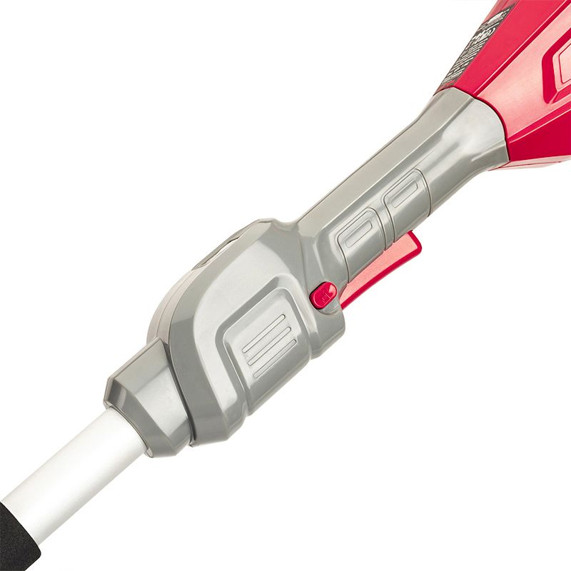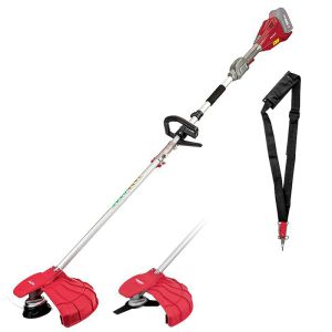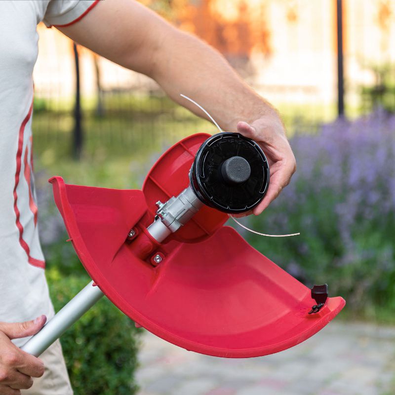 Кнопка блокировки пусковой клавиши и электронная система активации помогает избежать случайного включения инструмента. Наплечный ремень в комплекте помогает снизить нагрузку на руки и обработать газон быстрее и качественнее.