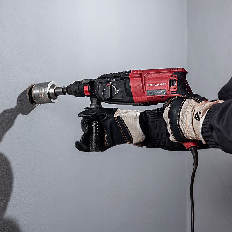 Мощный двигатель 850 Вт с силой удара 3,2 Дж позволяет легко выполнять демонтажные и сверлильные работы в различных материалах, бетон 26 мм, дерево 40 мм, сталь 13 мм.