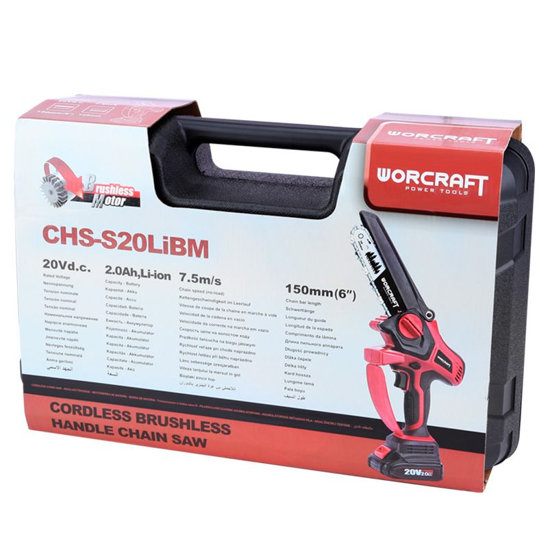 Аккумуляторная цепная мини-пила WORCRAFT CHS-S20LiBPM – портативная пила для распиловки досок, обрезки древесных веток и кустарника, различных столярных работ и множества других задач.