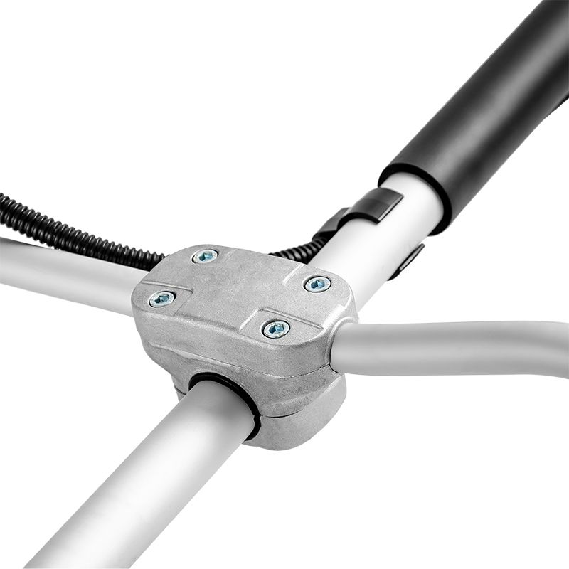 Надійна конструкція хрестовини кріплення ручок і фіксатора нижнього захисного кожуха полегшують складання мотокоси та збережуть міцність конструкції на довгі роки